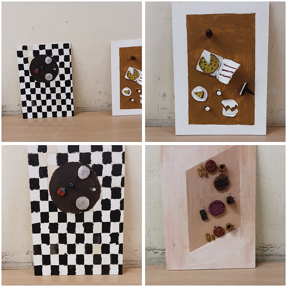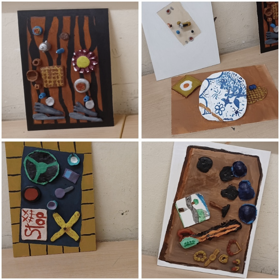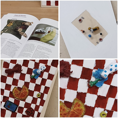 Der 9mk Kunst-Kurs hat sich im Unterricht mit den Arbeiten des Künstlers Daniel Spoerri beschäftigt. Bekannt wurde er durch seine „Fallenbilder“, in denen er Alltagsgegenstände so fixierte, wie er sie vorfand, und damit Momente des Lebens sichtbar machte.