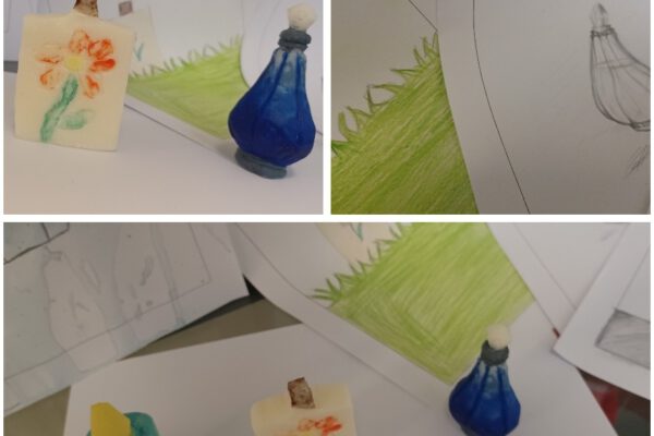 Auf dieser Grundlage fertigten die Schülerinnen Entwurfszeichnungen an und entwickelten eigene Gestaltungskonzepte. Anschließend schnitzten sie ihre Flakons aus Seife und setzten sich dabei intensiv mit Form, Proportion und handwerklicher Umsetzung auseinander und präsentierten ihr Werk angemessen.