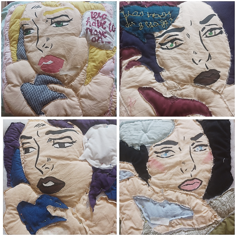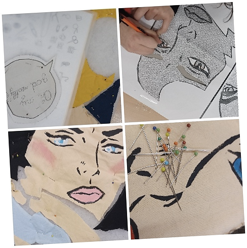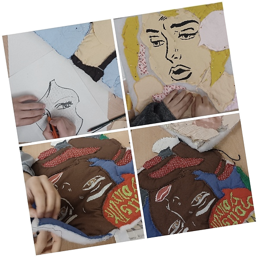 Im Textilunterricht gestalteten die Schülerinnen und Schüler des 10mk Kurses textile Bilder in Anlehnung an Roy Lichtenstein. Dabei griffen sie auf erlernte textile Techniken zurück und setzten diese gezielt ein.