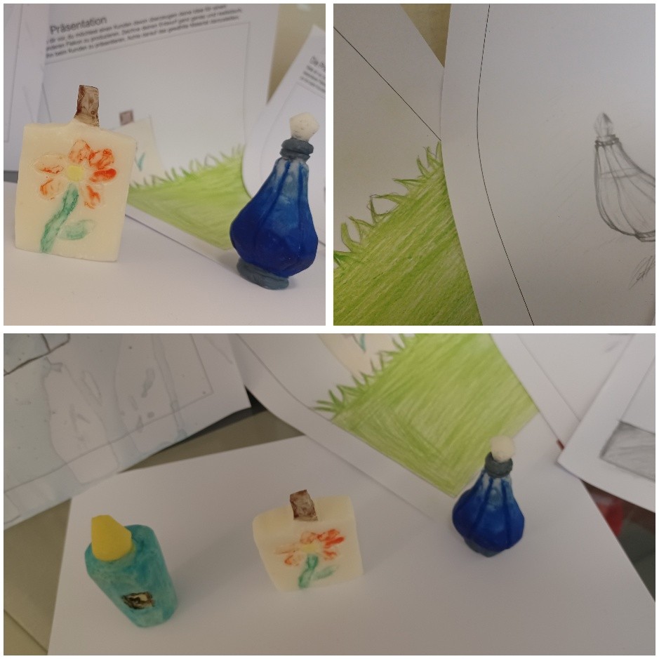 Auf dieser Grundlage fertigten die Schülerinnen Entwurfszeichnungen an und entwickelten eigene Gestaltungskonzepte. Anschließend schnitzten sie ihre Flakons aus Seife und setzten sich dabei intensiv mit Form, Proportion und handwerklicher Umsetzung auseinander und präsentierten ihr Werk angemessen.